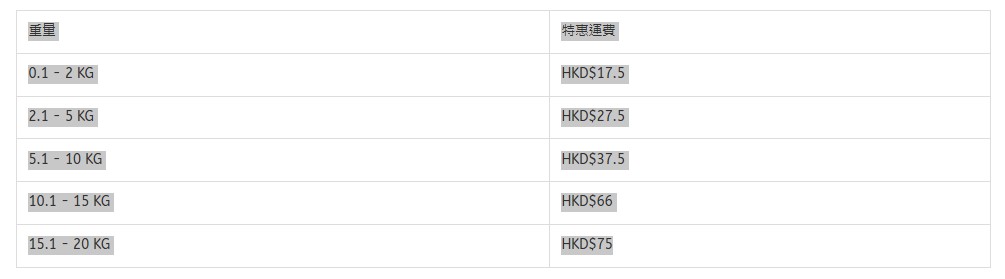 1. 最終依以實重計算 : 續重以HKD$4/kg 單位計算 ,每筆獨立包裹上限 20 公斤 (如因貨品量多而需要分開包裹則按照每個箱子的總材積重量計算收費,計算出來的材積重量與實際重量比較,取較大者為計費單位用以計算運費)